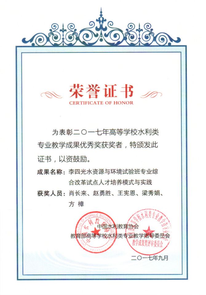 获得奖项:2017年高等公司水利类专业教学成果奖优秀奖