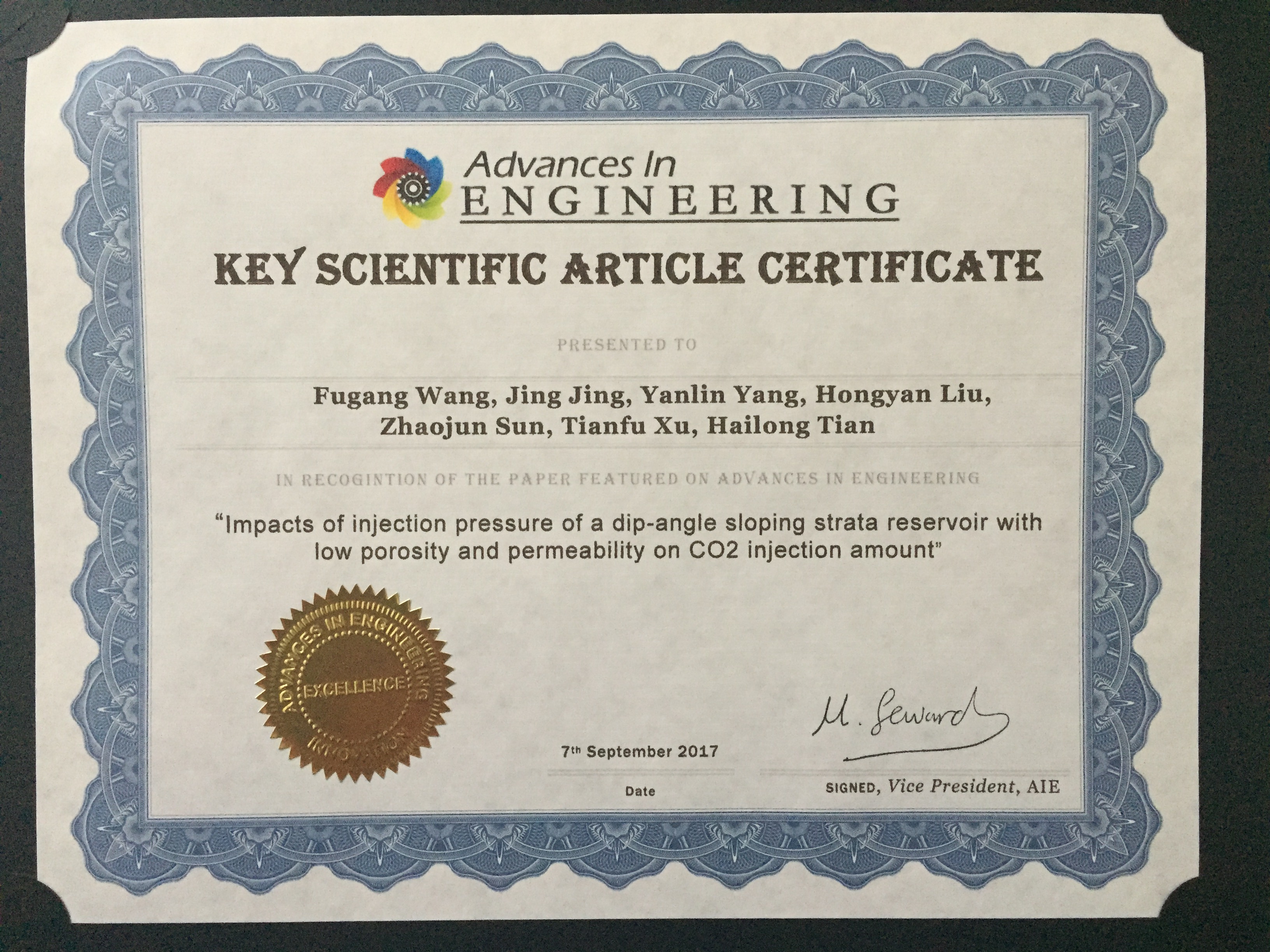 近期公司王福刚老师的论文“Impacts of injection pressure of a dip-angle sloping strata reservoir with low porosity and permeability on CO2 injection amount”被加拿大Advances in Engineering(AIE)组织选为工程进展领域有创新性的重要科学论文,并予以特别报道(证书附后)。