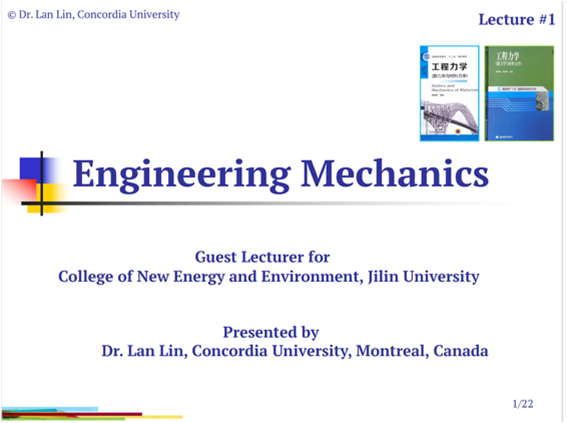 为推进哈哈体育双一流建设,满足疫情常态化情况下课程教学的客观需求,加强研究生国际化课程建设,打造哈哈体育研究生国际在线精品课程,公司邀请加拿大康考迪亚(Concordia University)大学的林岚教授通过10次线上课程为研究生们讲授静力学。林教授在康考迪亚大学两次荣获最佳讲课奖,是研究静力学方向的专家。