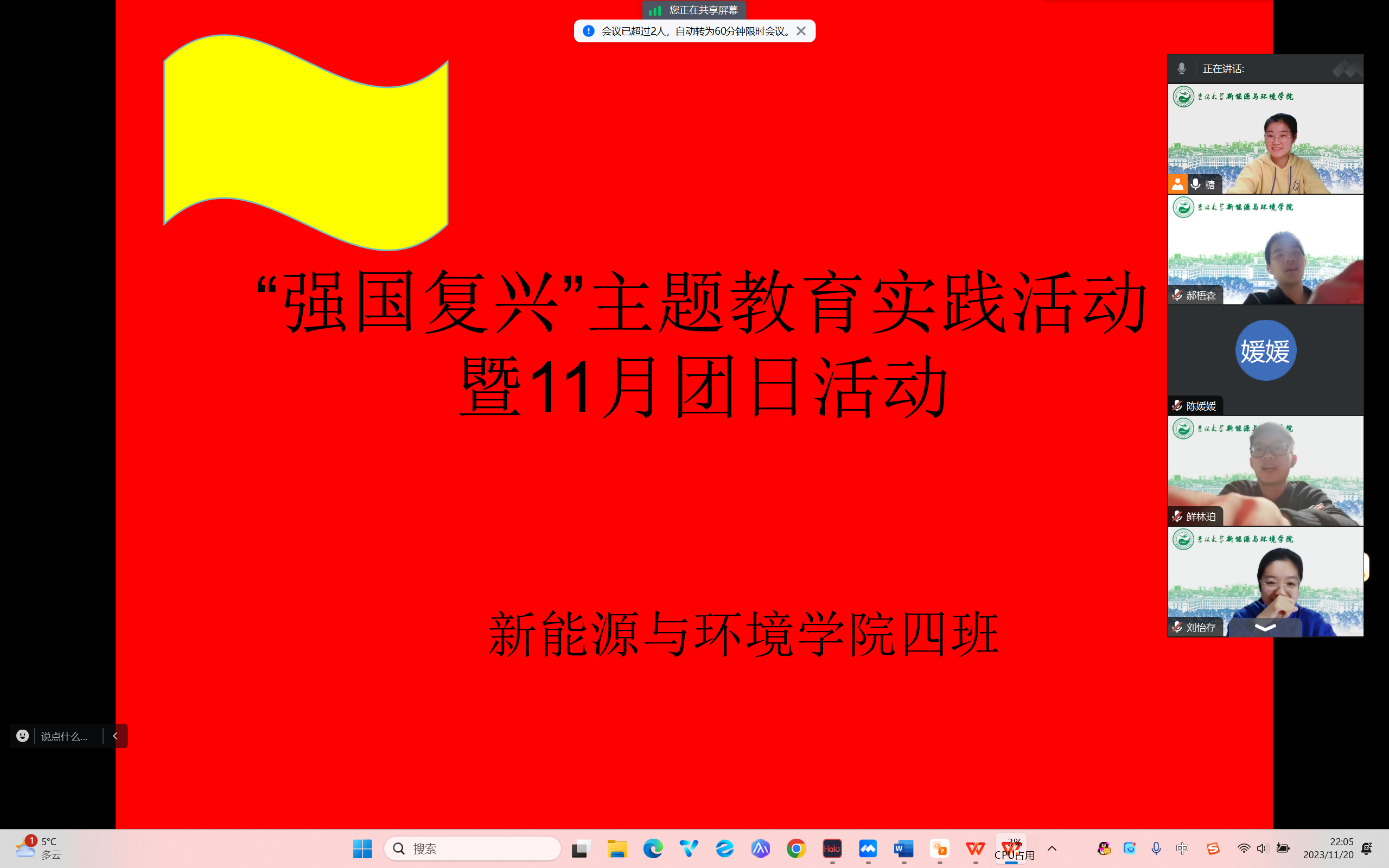 党的二十大以来,以习近平同志为核心的党中央高度重视、热情关怀青年、充分信任青年,鲜明的提出了党管青年原则,为深入学习党的二十大关于全面建成社会主义现代化强国,以中国式现代化全面推进中华民族伟大复兴战略和习近平总书记的相关重要论述。哈哈体育252304班团支部于十一月二十日晚六点在团支书唐烨的带领下开展“强国复兴”主题团日活动。此次活动共有包括团支部内25名共青团员在内的36位青年参加。