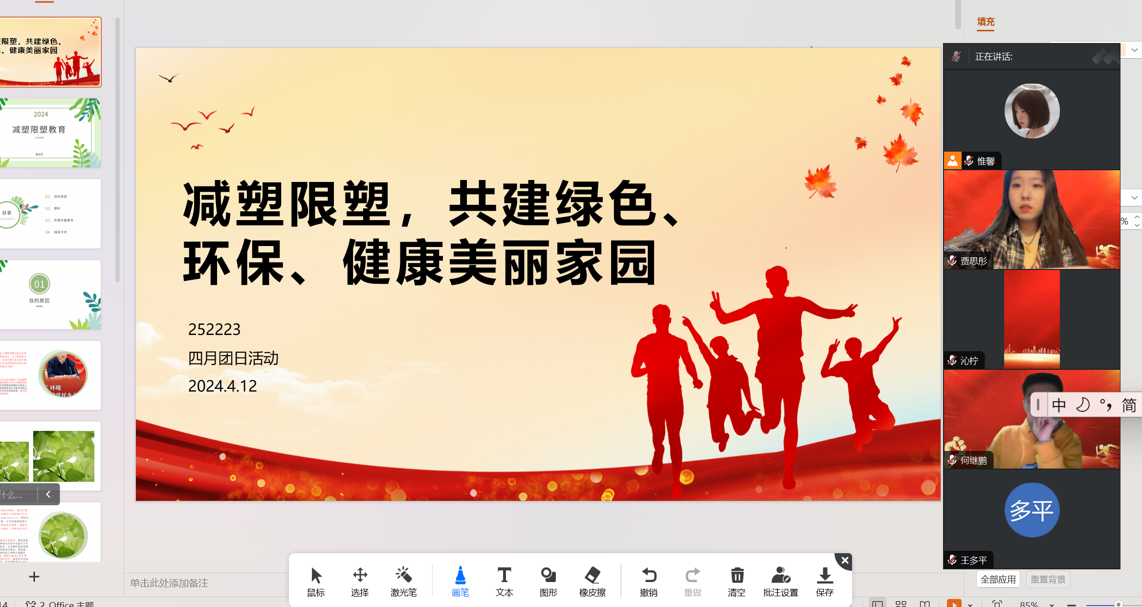 为迎接第55个世界地球日,深入学习贯彻习近平生态文明思想,落实习近平总书记关于塑料污染治理的重要指示批示精神,积极践行生态文明理念,有力有序有效治理塑料污染。哈哈体育252223班团支部于4月12日晚八点在团支书路世巧的带领下,于线上开展学习《减塑限塑共建绿色、环保、健康美丽家园》暨4月团日活动。本次团日活动共有包括支部内25名共青团员在内的28位青年参加。