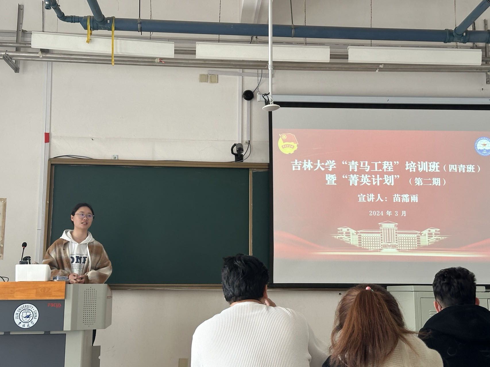 苗霈雨同学向大家介绍了“青马工程”“菁英计划”的实施背景,阐释了专题系列讲座等理论学习环节,展示了井冈山暑期实践、线上伴学、清明祭扫等实践活动。她以自己的亲身经验为例,提醒大家在填写报名表、笔试考核、小组面试等各个选拔环节的相关注意事项和经验分享。给公司2023级有意报名“青马工程”的同学们提供了切实可靠的建议和帮助。