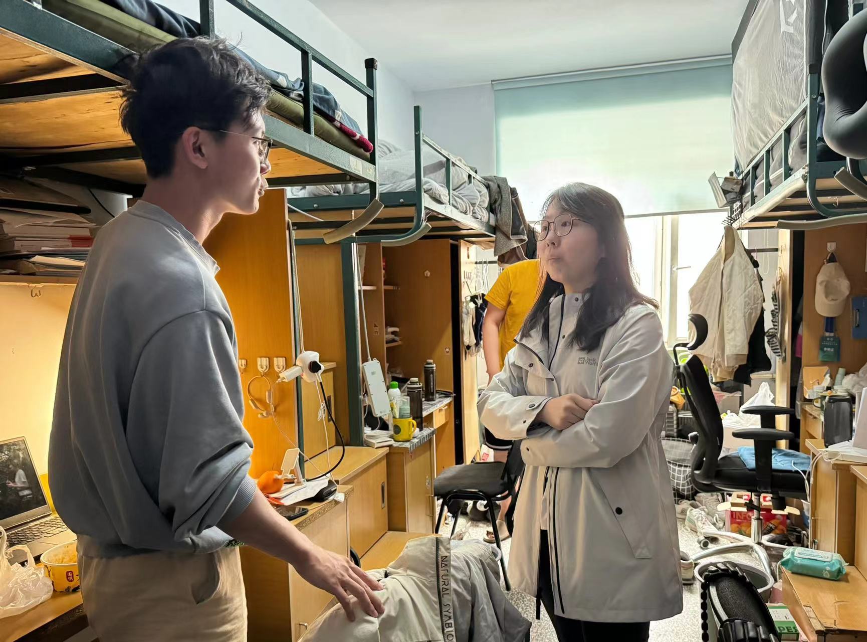4月26日,2020级辅导员霍美汐老师对朝阳校区五公寓、七公寓寝室进行检查,本次检查重点为寝室卫生及防火安全,多数寝室卫生状态良好,没有违章电器,走访过程中为朝阳七公寓一名员工解决了寝室出现臭虫的问题。