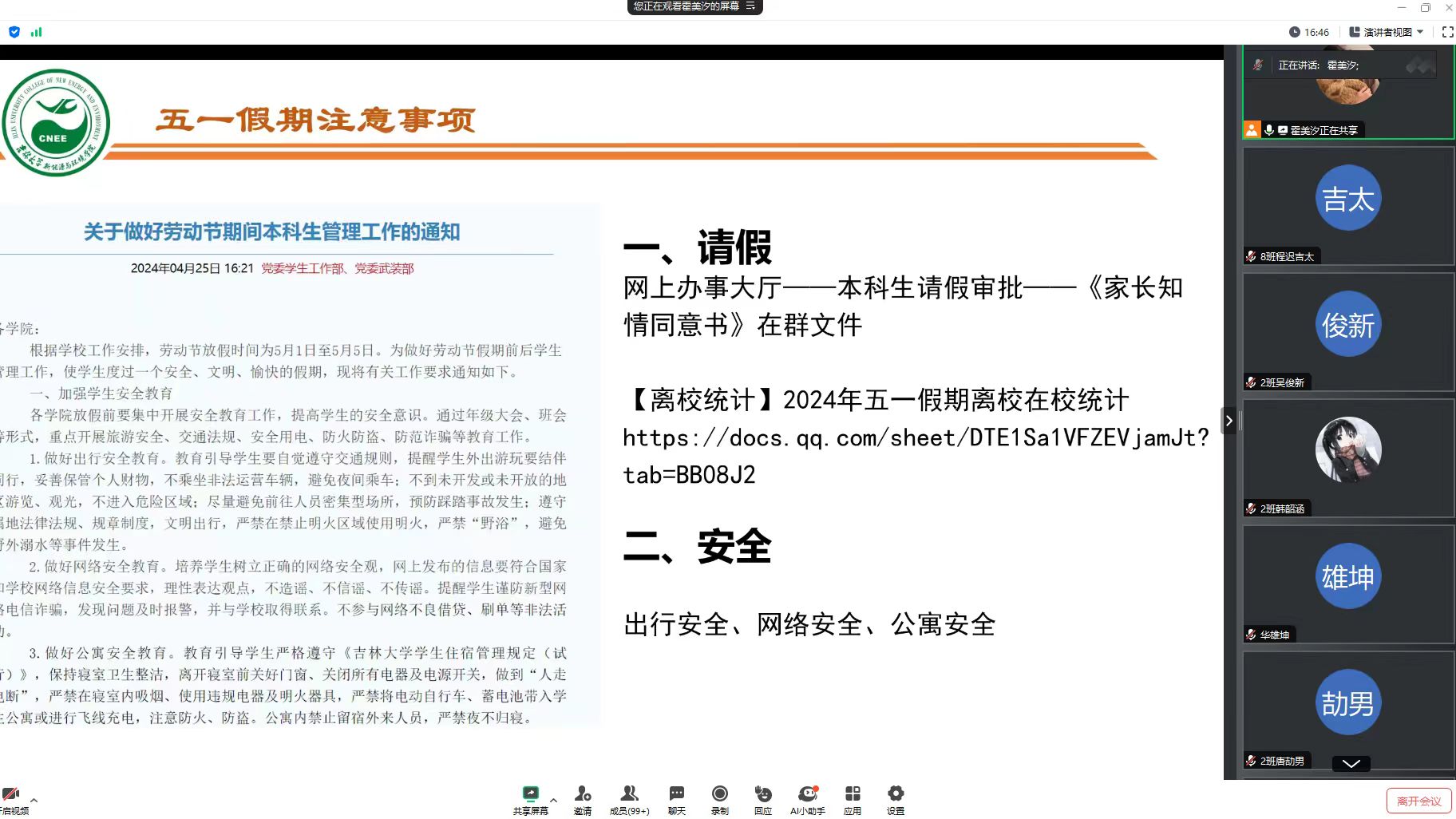 各年级大会主要内容有三方面。一是注意出行安全,无论是外出旅游还是归家探亲,都应当文明出行,提升自我保护意识,遵守法律法规、规章制度,避免意外事件发生。二是注意网络安全,网上“冲浪”应当理性警惕,谨防新型网络电信诈骗,不要“贪小便宜吃大亏”。三是主要公寓安全,应当保持寝室整洁有序,外出前关好门窗,做到“人走电断”。同时提醒各位同学,做好本次假期在校离校报备登记,与家长老师保持联系;非节假日期间离校提前申请,返校后按时销假;不要以年级、班级等名义欺骗家长外出游玩;鼓励各位同学关注校内通知,积极主动参加劳动教育主题实践活动。
