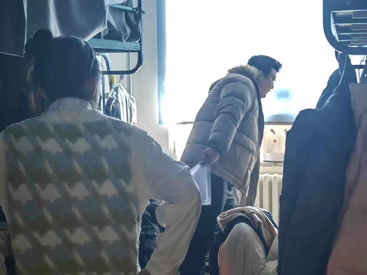 12月19日,2022级辅导员母茂松老师进入朝阳校区五公寓进行寝室安全卫生检查,对部分杂乱寝室提出整改要求,同时询问员工寝室供暖情况。