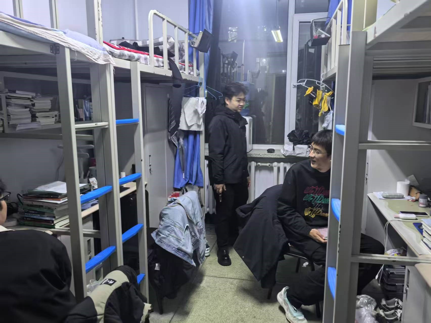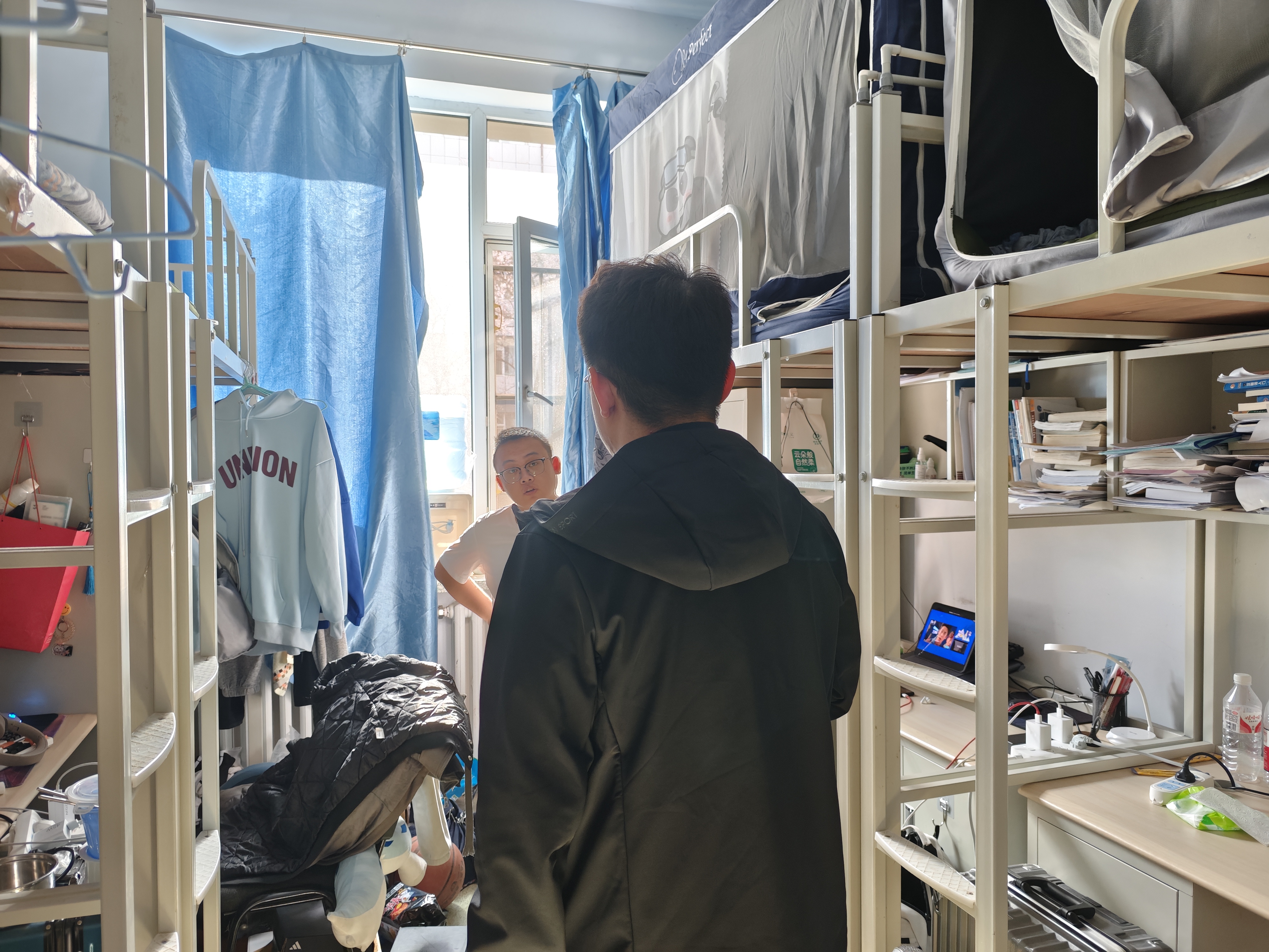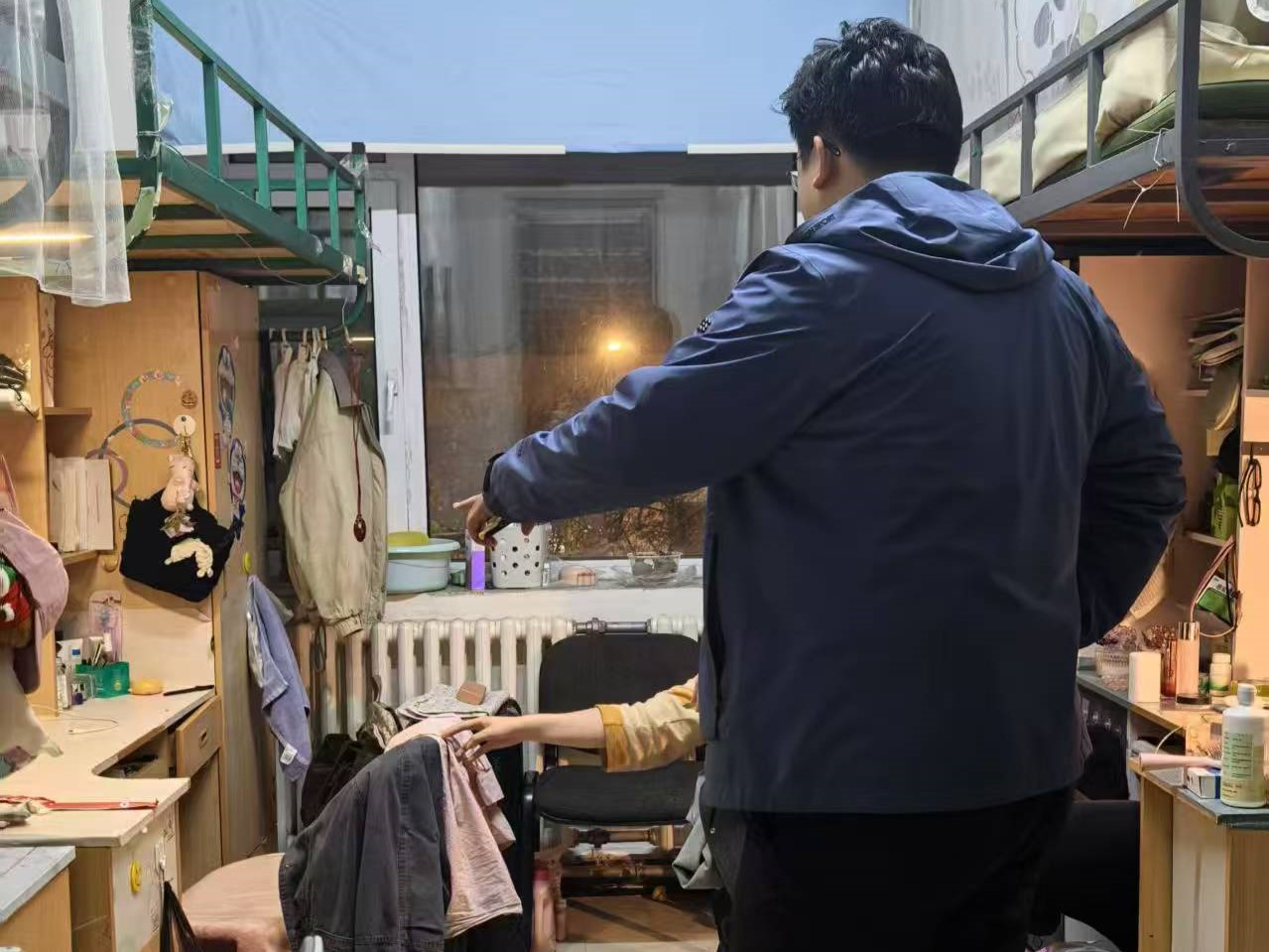 4月18日,2024级新生辅导员助理姜兆轩进入南苑一公寓员工寝室,检查公寓卫生及消防安全情况,同时查看转专业员工寝室调整情况,确保转入员工均已完成寝室调整。