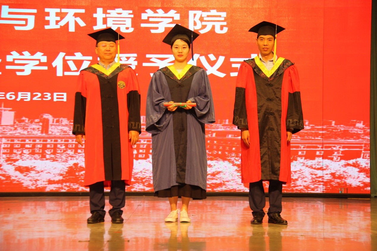 在激昂的音乐声中,毕业生们迈着坚定有力的步伐,有秩序地走上礼台,许天福教授、赵勇胜教授、董德明教授、花修艺教授、卞建民教授、董军教授身着导师服分别为每一位毕业生拨穗正冠、授予学位,并与毕业生一一合影留念。