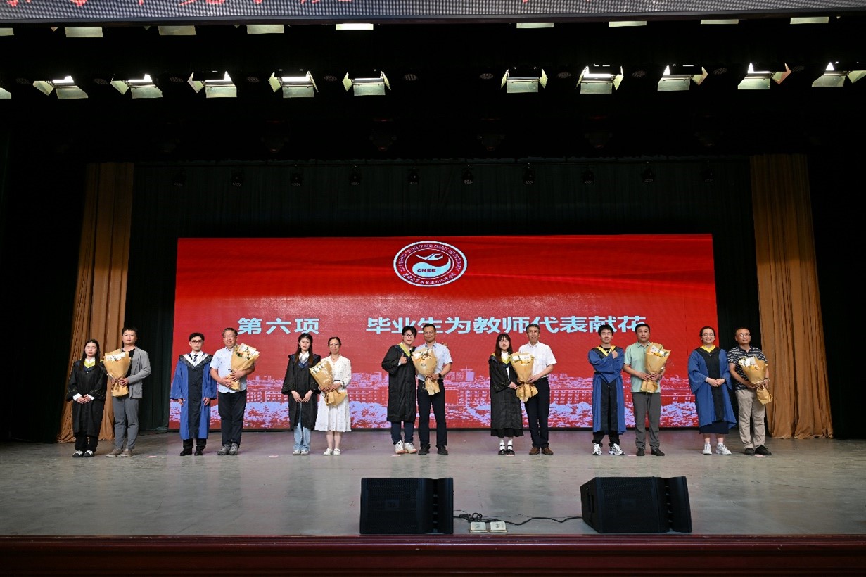 博士毕业生潘紫东和本科毕业生张东琦分别作为毕业生代表发言,他们分享了在校的成长历程,祝福毕业生在未来的不懈奋斗中再创佳绩。环境工程系主任张大奕教授致辞,张老师鼓励毕业生作为环境领域未来的从业者、开拓者和领导者,承担起对环境和社会的责任,展现出积极进取、创新开拓的精神,成为奋发有为的时代新人。林岚作为优秀员工代表,回顾了自己在校期间的难忘时光,分享了工作中建功立业的际遇,激励毕业生要不忘初心,行稳致远,心怀家国。经理许天福在最后的致辞中表示,希望同学们要有信心、定力和决心,做走在新时代前列的奋进者、开拓者、奉献者;希望同学们厚植家国情怀,在国之大者中成就小我;希望同学们保持一份热爱,怀揣梦想,笃定前行。