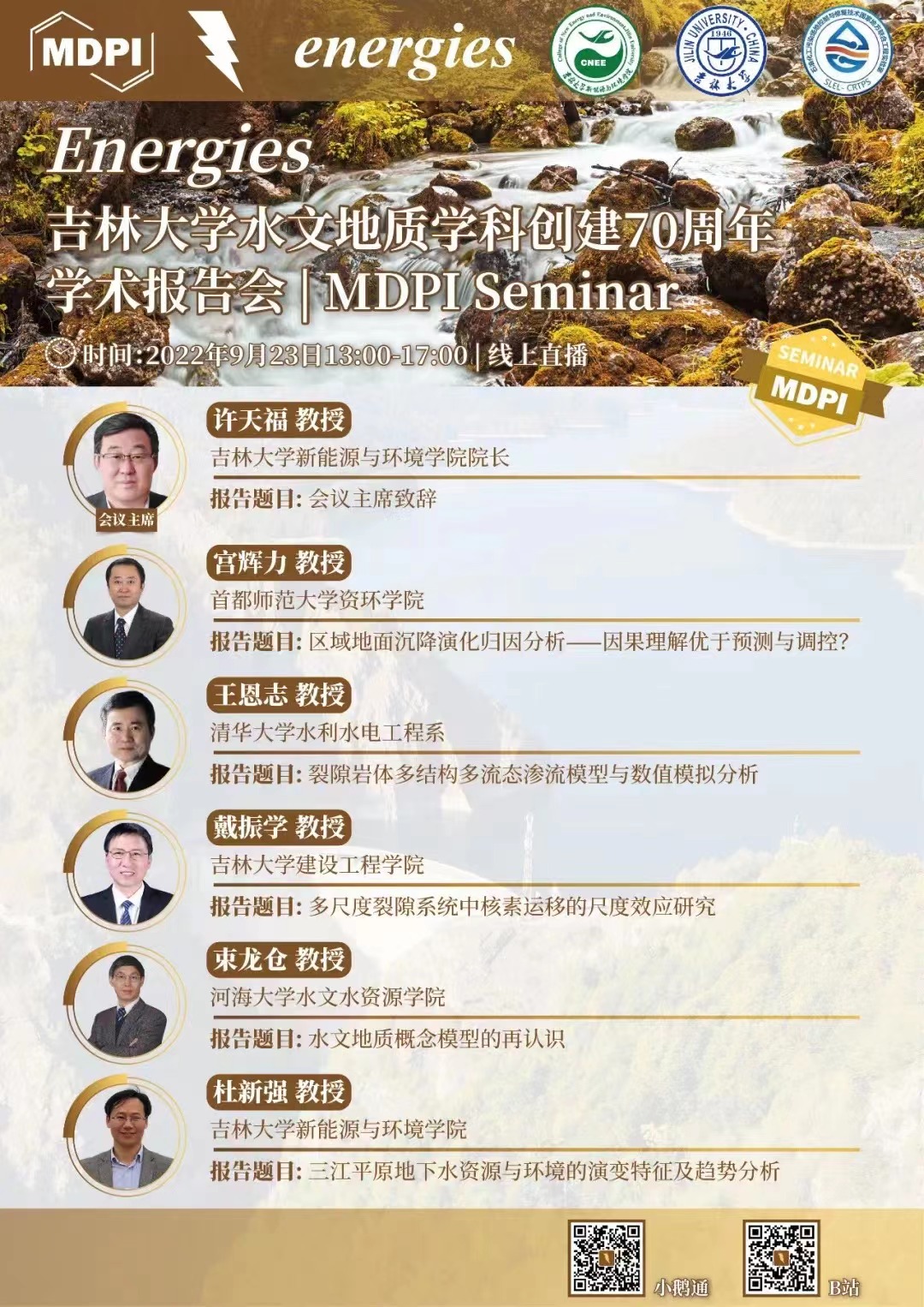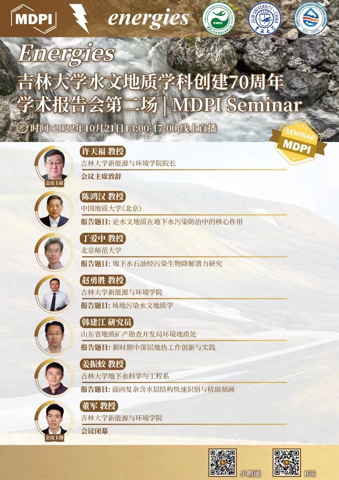 2022年是HAHA体育水文地质学科(原长春地质公司水工系)创建70周年,承载着全院师生和广大员工光荣与期望,是公司凝聚力量、继往开来的崭新起点,更是哈哈体育发展历程中的重要里程碑。公司携手Energies 期刊通过MDPI线上直播平台举办了两场庆祝HAHA体育水文地质学科(原长春地质公司水工系)创建70周年学术报告会;在世界“水日”、“地球日”和 “环境日”举办相关领域的3场专场学术报告;举办5场暑期中青年学者学术论坛。