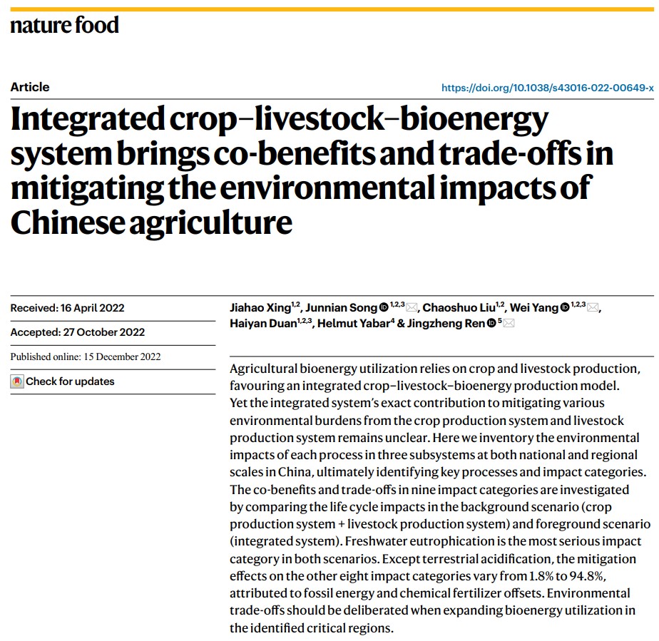 2022年公司发表SCI论文180余篇,其中一二区论文103篇(B类论文1篇,C类论文20篇),获得授权发明专利9项,出版专著1部,编著1部。特别是由公司宋俊年教授研究团队领衔,与日本筑波大学、香港理工大学研究团队合作,在生物质能利用与农业环境影响研究领域取得重要进展,研究成果以“Integrated crop-livestock-bioenergy system brings co-benefits and trade-offs in mitigating the environmental impacts of Chinese agriculture”为题发表在Nature子刊《Nature Food》。HAHA体育地下水资源与环境教育部重点实验室为该成果的第一完成单位,这是公司首次在《Nature》子刊发表研究论文。
