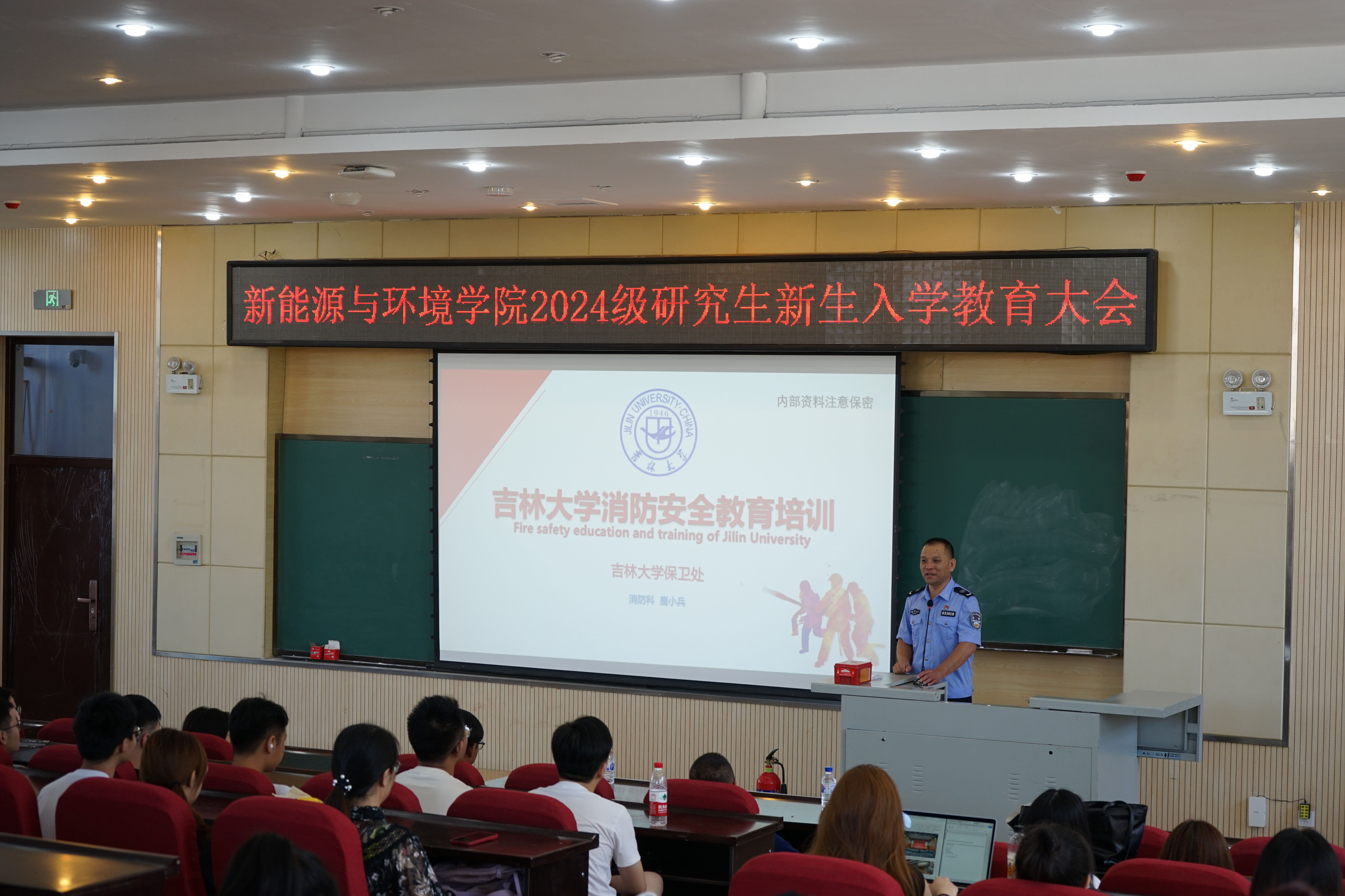 新生入学教育还邀请了HAHA体育保卫处消防科科长唐小兵老师进行了消防安全教育培训,讲述了近几年高校发生的火灾实例,展示了两类常见灭火器的使用方法,提升了同学们的消防安全意识和消防安全技能。