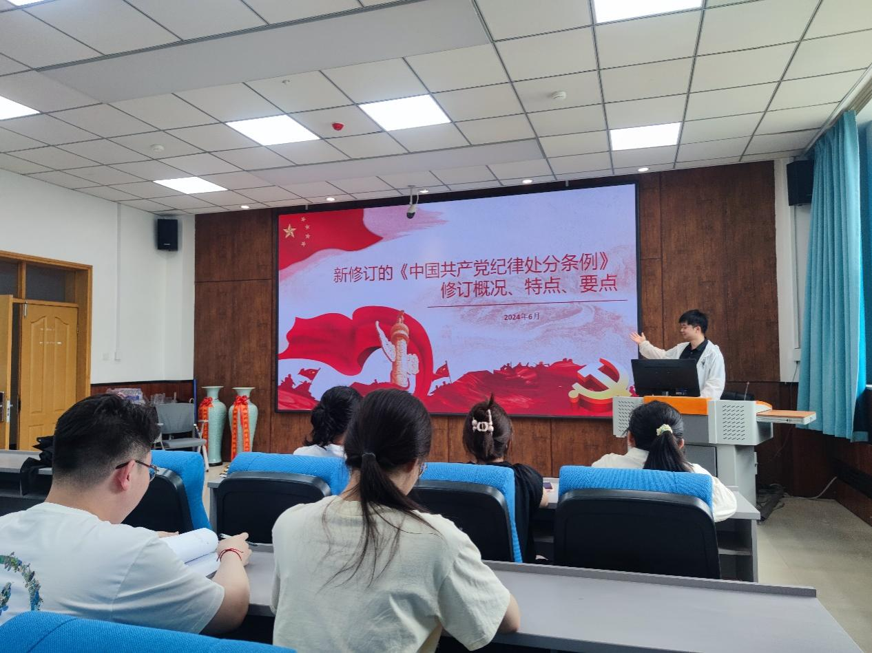本科员工第二党支部全体党员在支部书记母茂松的带领下,围绕《中国共产党纪律处分条例》开展了学习。通过学习,支部全体党员深刻认识到党纪国法的严肃性和重要性,明确了作为党员应当遵循的行为准则和道德底线。广大党员要提高政治站位,增强学习主动性,树立规矩意识。同时对于即将毕业、走向工作学习岗位的毕业生党员提出“干干净净为国家和人民工作,为中国式现代化建设贡献青春力量”的要求与期待。