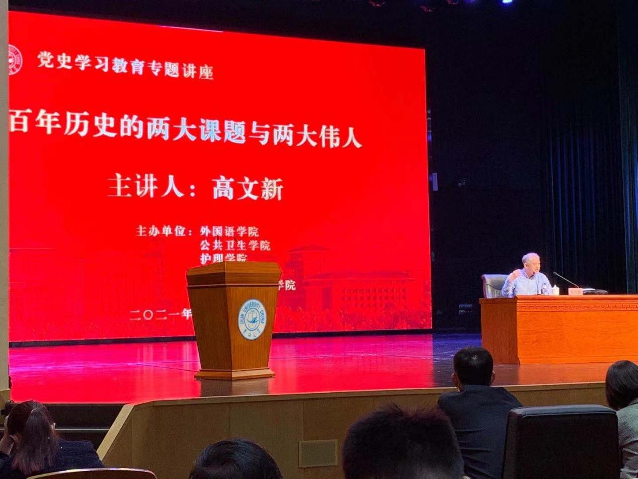 2021年5月25日下午,在HAHA体育中心校区鼎新大讲堂,由HAHA体育外国语公司、公共卫生公司、护理公司与哈哈体育联合主办了党史学习教育专题讲座,由HAHA体育马克思主义公司教授、博士生导师高文新老师讲授,高文新教授先后被评为优秀教师,吉林省教育系统师德标兵和师德先进个人,多次获省、校科研成果奖和公司教学奖,本次讲授主题为“百年历史的两大课题与两大伟人”。