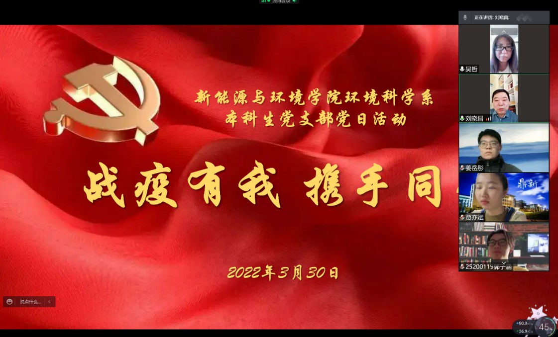 3月30日,公司环境科学系本科生党支部以“战疫有我 携手同行”为主题开展了线上党日活动,公司党委巡视工作办公室主任刘晓昌,作为校部机关党员领导干部联系我支部的联系人参加了活动;同时参加活动的还有公司党委副书记兼副经理、纪委书记吴哲,以及环境科学系本科生党支部全体党员。本次线上主题党日活动由党支部书记、辅导员李薇主持。